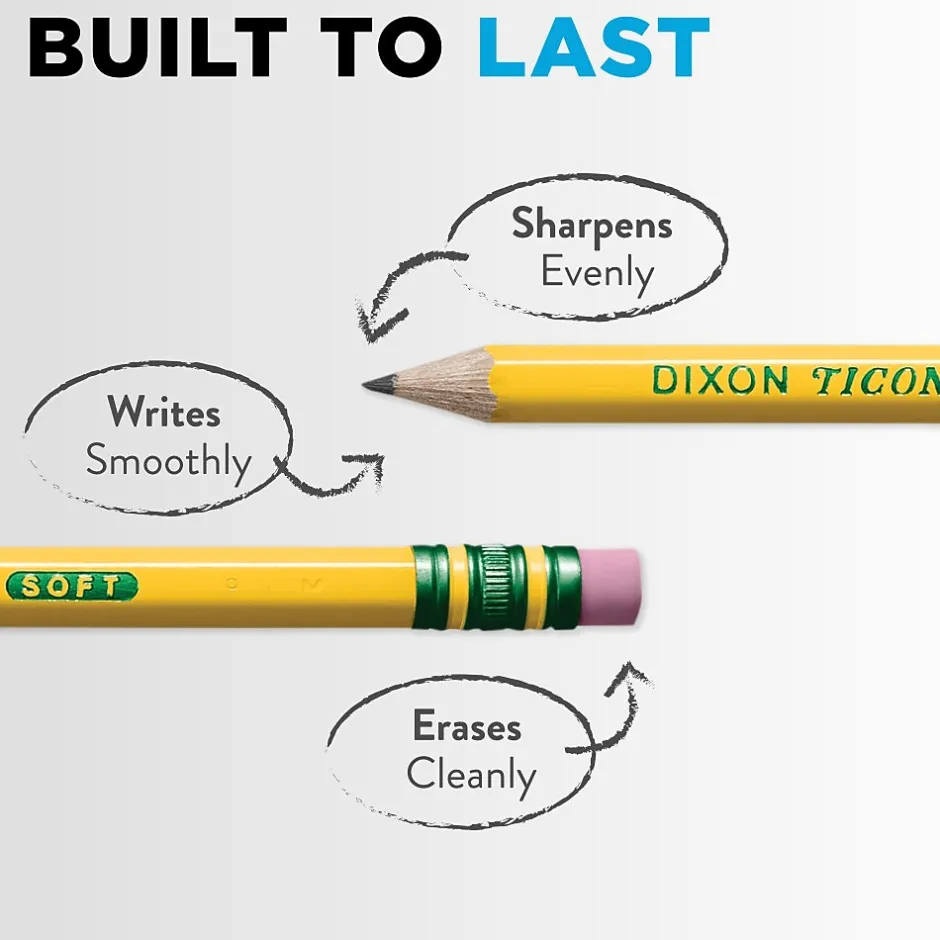 Write papers with these wood-cased pencils. Each pencil has a latex-free eraser that cleans mistakes without making a mess, while the premium wood case allows for a comfortable grip and easy sharpening. These Ticonderoga yellow-barrel wood-cased pencils are PMA-certified nontoxic.