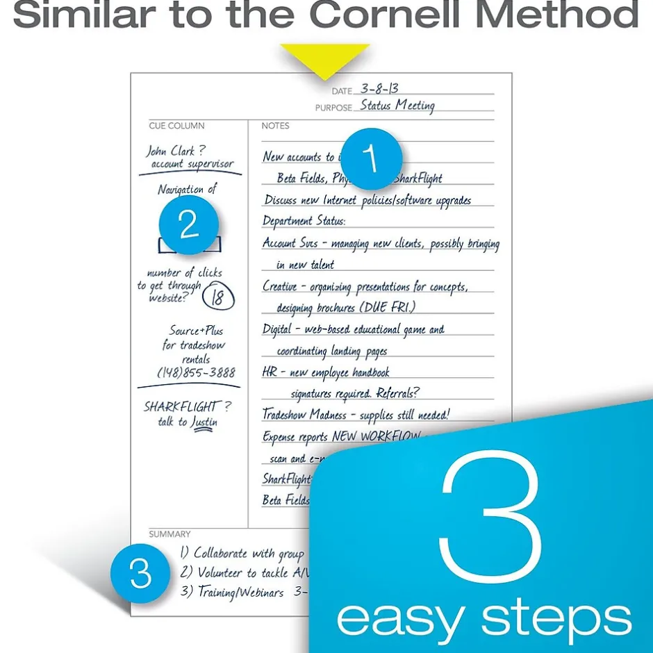 - Cue column, note field, summary sections, date and purpose fields speed up note-taking