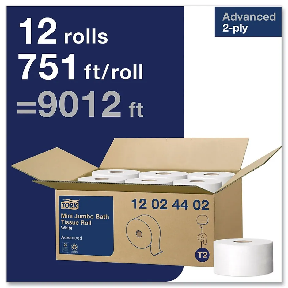 TorkĀ® Advanced Jumbo Bath Tissue’s high capacity allows for fewer refills and reduced labor. Our roll design ensures easy and intuitive maintenance, refilling and use. Large size reduces pilferage as it is hard to conceal and can’t be used at home. Suitable for high to medium traffic restrooms and easy to maintain. This bath tissue is perforated for ease of tearing. Fewer cores and no wrappers leads to source reduction and less waste. Tork toilet paper has rapid breakup, ideal for all plumbing systems. All Tork bath tissue products are safe for septic systems. Available in an Easy HandlingĀ® carry box.