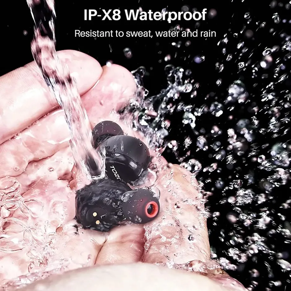 - IPX8 Waterproof: Earbuds and charging case inner Nano-coating makes it possible to waterproof for 1 meter deep for 30 minutes. It is suitable for sports to prevent water. Ideal for sweating it out at the gym. Earbuds and cases even can be washed with water and soap.