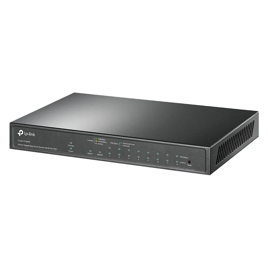 The TP-LINK professional 10-port gigabit smart switch with eight-port PoE+ is an easy-to-use multipurpose PoE switch with powerful performance. The TL-SG1210MPE is fully compatible with PoE devices, such as IP cameras, access points, and IP phones. It also works with non-PoE wired devices, such as PCs, printers, and IPTV. Compliance with the 802.3af/at PoE+ standard supports up to 30W on each PoE port. The total 123W PoE power budget for the eight gigabit PoE+ ports makes it perfect for a wide range of applications, such as surveillance, offices, dormitories, and small businesses. It is fully compatible with IP cameras, access points, IP phones, computers, printers, and more.