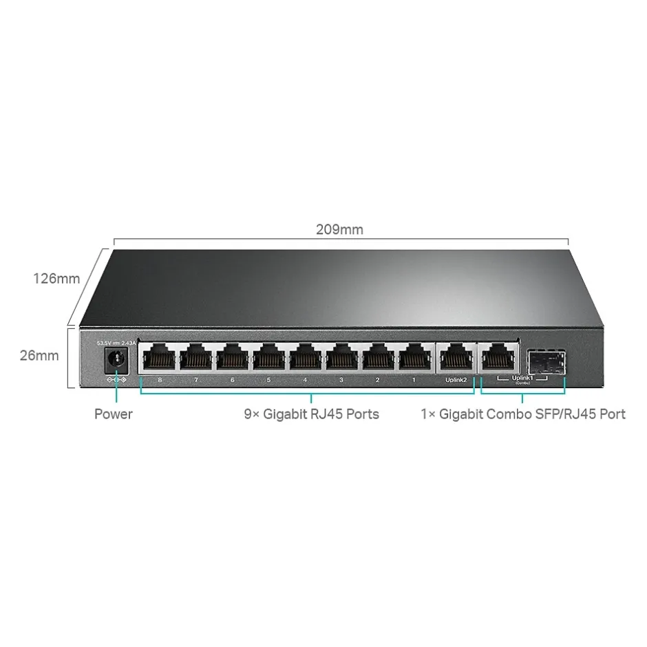 - Professional smart switch featuring 9 x gigabit RJ45 ports and 1 x combo gigabit SFP/RJ45 port (supports PoE power up to 123W for all PoE ports)