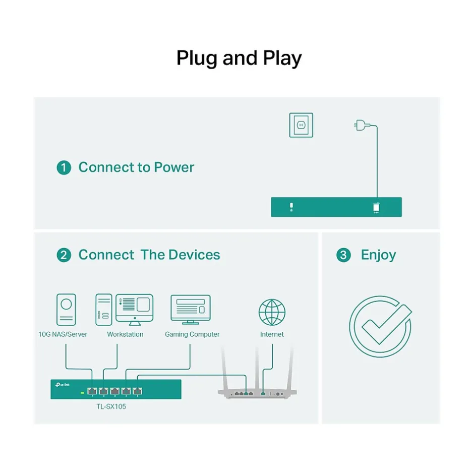 As the flagship 10G product, the TP-LINK TL-SX105 is a five-port 10G desktop switch, providing up to 100Gbps of switching capacity. Auto negotiation five-speed (100Mbps/1G/2.5G/5G/10G) connections sense the link speeds and intelligently adjust for compatibility and optimal performance for all your devices, including 10G NAS, 10G server, workstation, gaming computer, 2.5G/5G/10G Wi-Fi 6 AP, 8K video, desktop, and more.