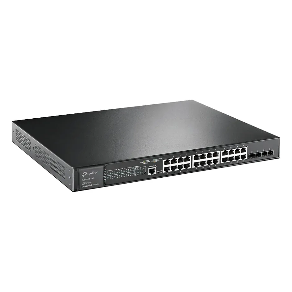 The TP-LINK JetStream 10G uplink managed switch comes with 24 PoE+ ports for a complete Omada network. Four 10Gbps SFP+ slots provide non-blocking switching performance and ultralow latency, so reliable and lightning-fast connections to servers and other switches are easily built. The switch supports a total PoE power budget up to 384W. Designed to use a single Ethernet cable for both data and power transmission, the switch offers flexible deployment for PoE-supported devices, such as wireless access points, IP cameras, and IP phones, lowering infrastructure costs for small businesses.