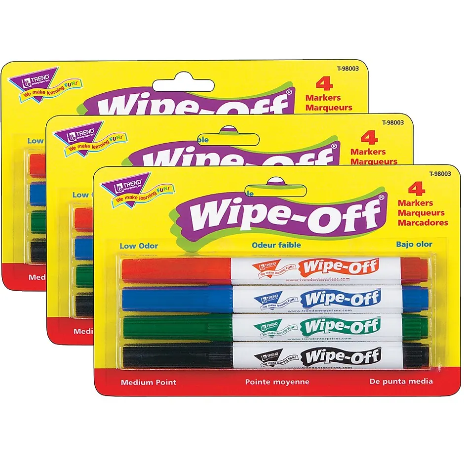 Use on any Wipe-Off® surface to extend learning. Rich colors and a trilingual format add variety and value. Long-lasting, nontoxic ink wipes clean with a dry tissue. Pack includes green, red, black, and blue. Sold as a set of 3 packs, 12 markers total.