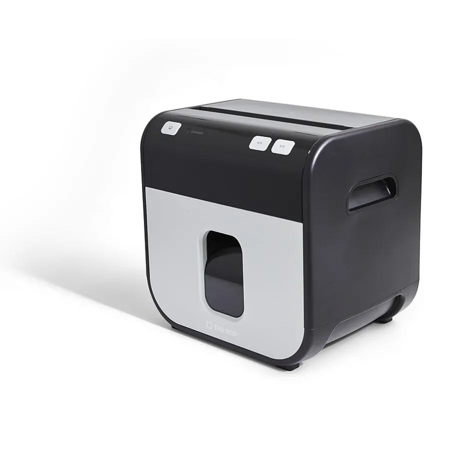 TRU RED™ Mailmate is the perfect solution for today’s home or small office shredding needs. The compact size allows placement on counters, desktops, or under tables or worksurfaces. A powerful motor shreds paper, cards, and CD’s down to 4mm x 12mm particles, giving you the security demanded by today’s business world. The 1.4 gallon waste bin has an easy to view side window, letting you see when to empty at a glance.