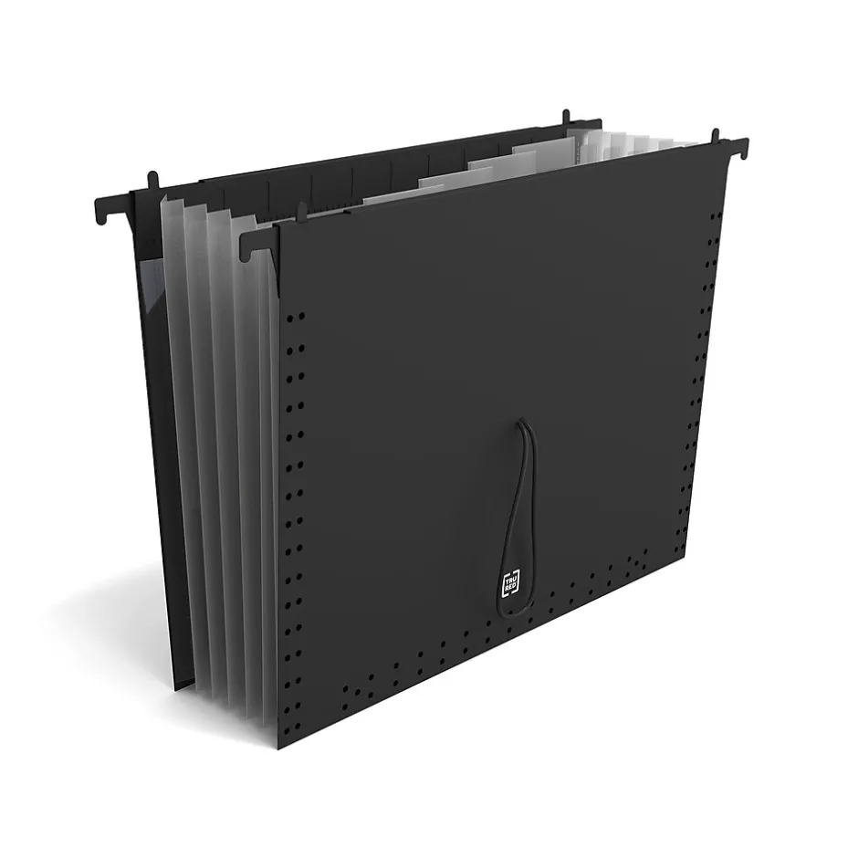 Protect papers with this hanging file folder. The seven pockets offer support for further categorization options, while top tabs provide adequate space for labeling and help you locate projects easily. An expandable spine creates extra room for larger files. This TRU RED letter-size black poly hanging file folder features a distinct color to help color-code your records by the client or subject.