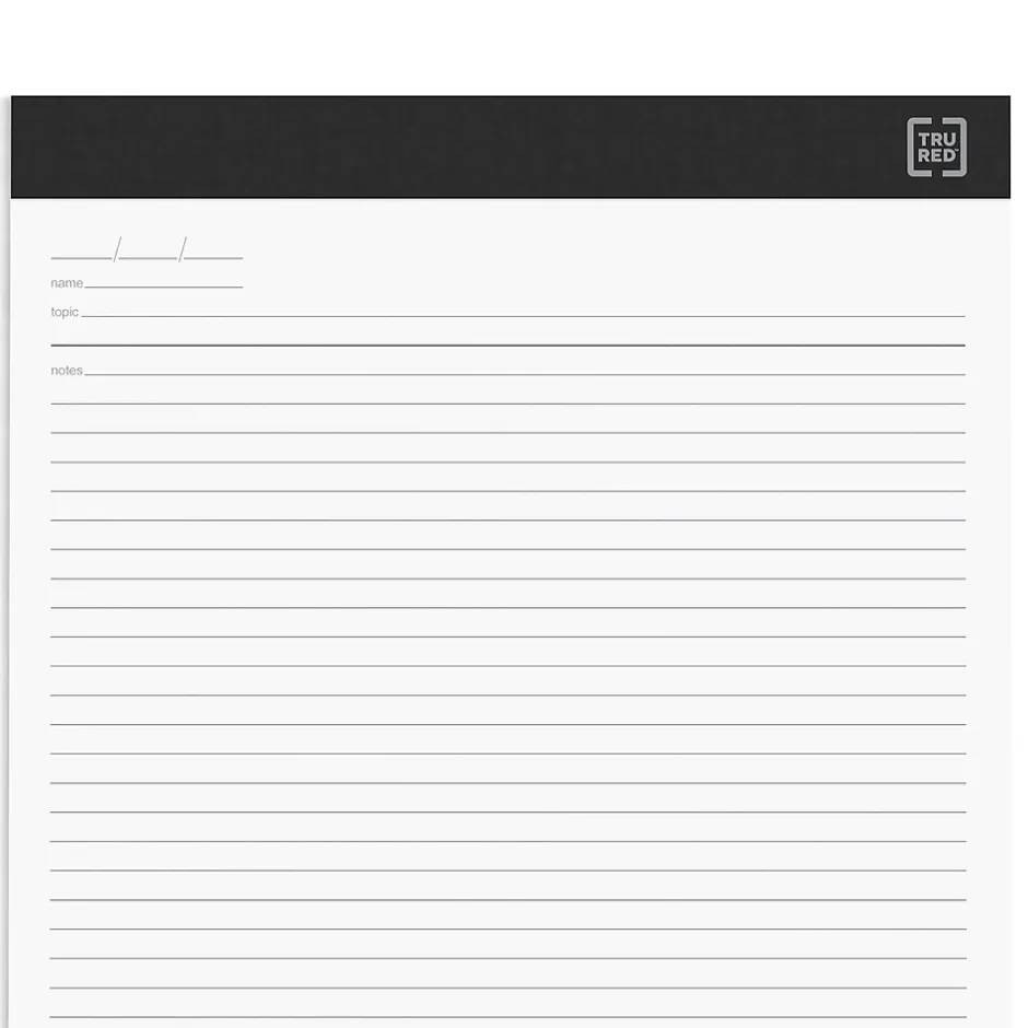 Provide a rigid surface for smooth writing with these perforated pad. The meeting agenda format helps you capture important details, while the perforated design makes it easy to share pages. Featuring a top-bound construction, this 20-pound paperweight notepad lets you flip through pages while reviewing written notes. The laminated backing on these TRU RED™ 8.5 x 11.75-inch white heavyweight pads matches the header color to deliver a professional look.