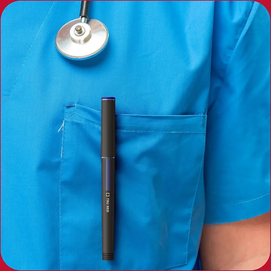 Fill your desk drawer with this ample supply of blue rollerball pens. The matte finish and carbon steel clip provide a professional look, while the airplane-safe construction lets you bring the pen inside pressurized cabins without leaks. Create crisp, clear lines using the 0.5mm conical tip. This TRU RED 0.5mm blue rollerball pen has a transparent window so you can see the ink level.