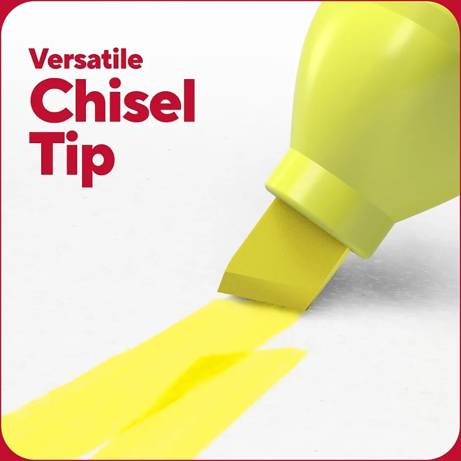 Highlight all the key information you want to remember in big swipes of bold color or create bright, thin lines for important notes with these versatile chisel-tip highlighters. The vibrant fade-resistant ink helps to keep any marked documents clear for studies or work. A large tank size and ink reservoir are ideal for your biggest projects with up to 300 meters of ink life per marker. Our Squircle™ barrel shape offers a comfortable grip and keeps these highlighters from rolling away while rubberized grips provide extra comfort. The odorless, non-toxic TRU RED tank highlighters 5-pack can be shared with a team or classroom ready to focus in any space.