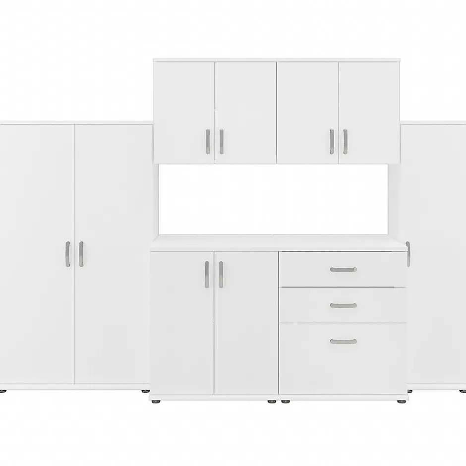 - Bundle includes: tall storage cabinet with doors, tall narrow storage cabinet, floor storage cabinet with doors, floor storage cabinet with drawers, set of two wall cabinets with doors