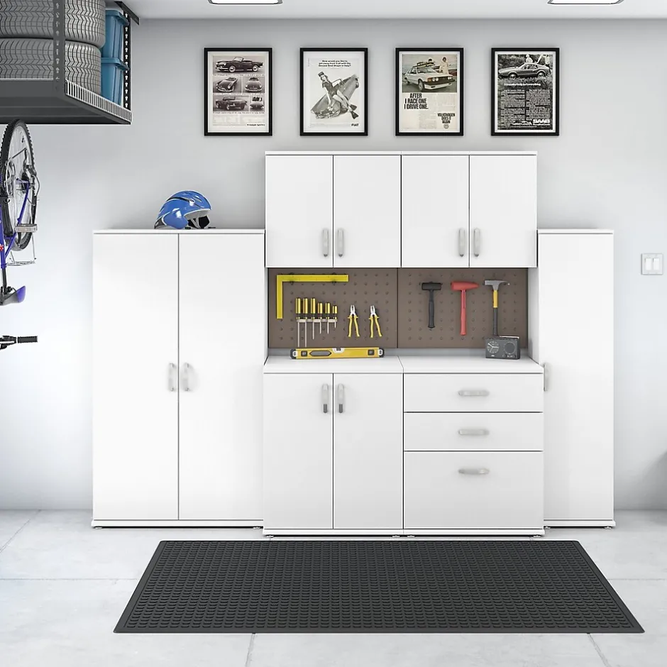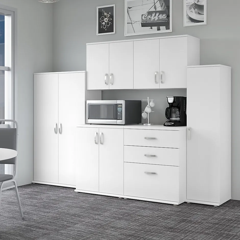 The Bush Business Furniture Universal 108″W six-piece modular storage set with floor and wall cabinets features commercial-quality designs and contemporary styling that suits virtually any home or professional environment. Organize your office, break room, garage, laundry room, or any other work or living space with storage furniture that’s built to last and offers plenty of room for supplies, materials, and equipment. The floor storage cabinet with doors, tall storage cabinet, and tall narrow storage cabinet combine fixed and adjustable shelving to accommodate items of various sizes. Two wall-mounted cabinets also contain one fixed and one adjustable shelf each for flexible, space-saving storage. Additional tools and supplies can be stashed inside the three-drawer cabinet. This cabinet set has been tested to meet ANSI/BIFMA standards for safety and performance and is backed by a 10-year warranty.