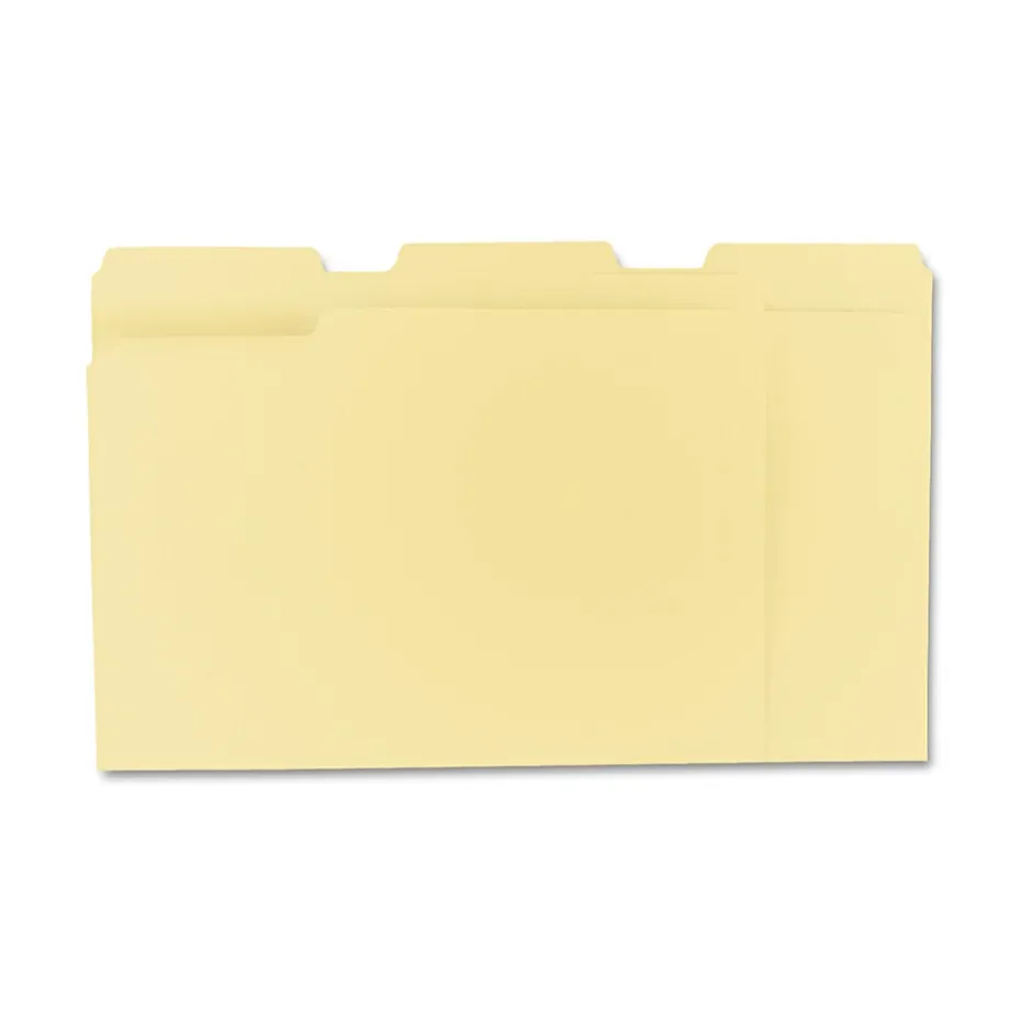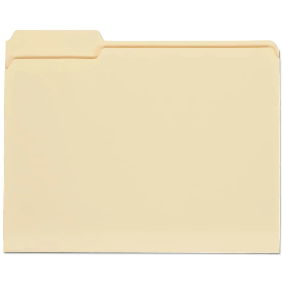 The top tabs are undercut to provide a generous indexing area for detailed labels and titles, and the classic folder construction resists snags and tearing in crowded filing drawers. The 11-point manila material of these Universal top-tab file folders is triple-scored to support large files and prevent sagging.