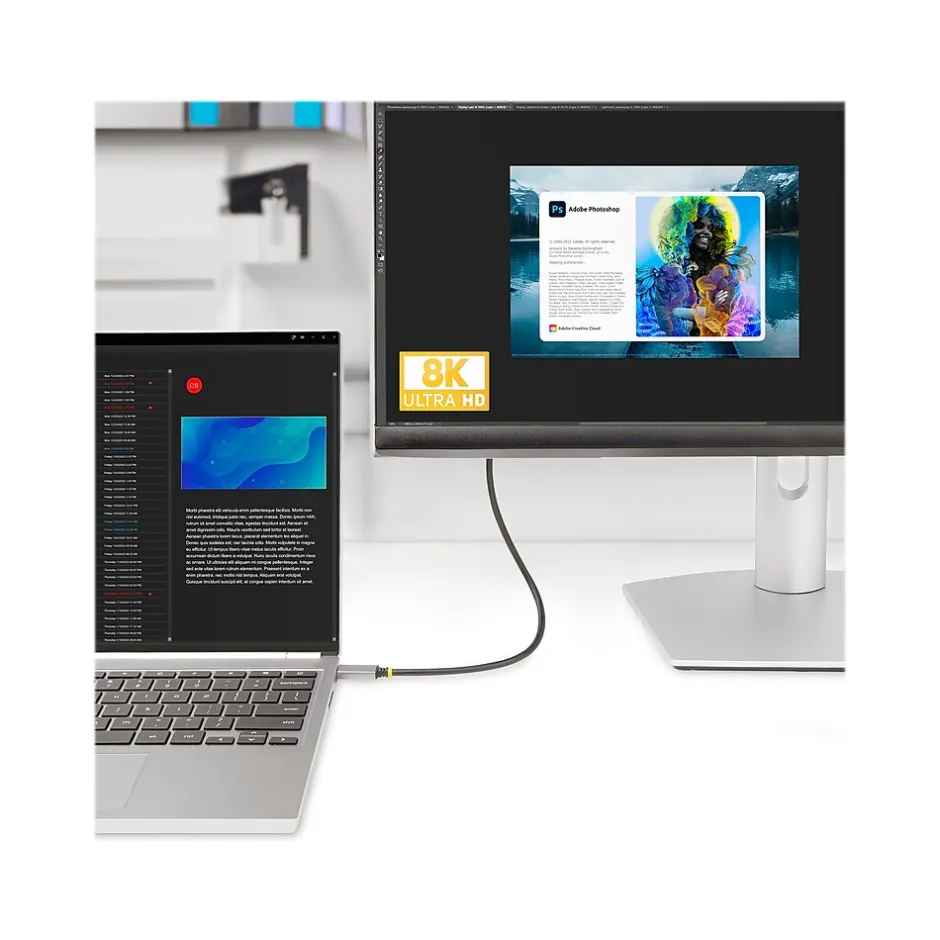 - USB-C to HDMI adapter cable connects a USB-C DP Alt-mode source to an 8K 60Hz/4K 144Hz HDMI display