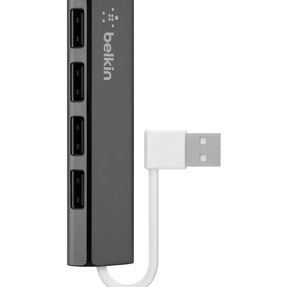 The Belkin ™ black ultra-slim travel USB hub adds four quick access USB ports to your PC, Mac or laptop/netbook/Ultrabook. It transmits data at the rate of 480 Mbps. It is ideal for connecting a keyboard, mouse, thumb drive, charging cable or any other USB-enabled device. This plug and play hub does not require installation of drivers. It is Mac/PC compatible.