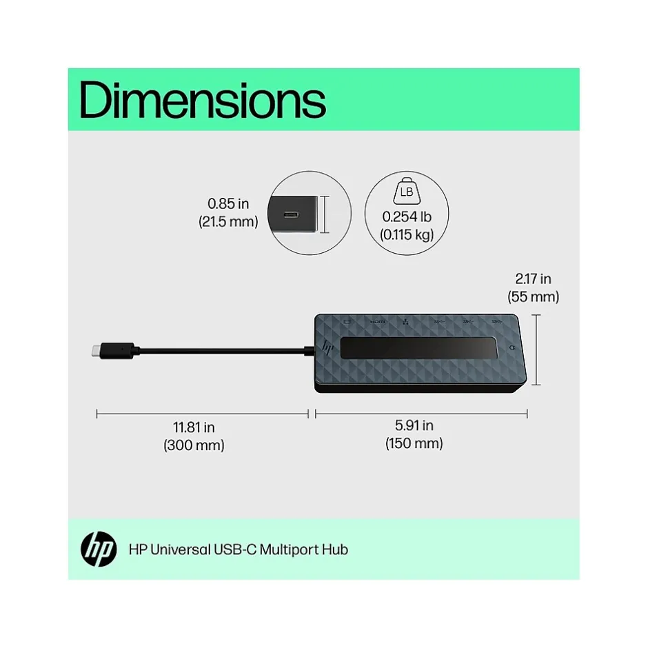 Unlock possibilities with the HP USB Type-C universal multiport hub, now supporting any USB Type-C compatible PC. Seven ports, one power and data pass-through cable, and many peripherals to plug and play however you like. It also supports dual 4K displays via HDMI and one DisplayPort. This hub is all you need to stay connected.