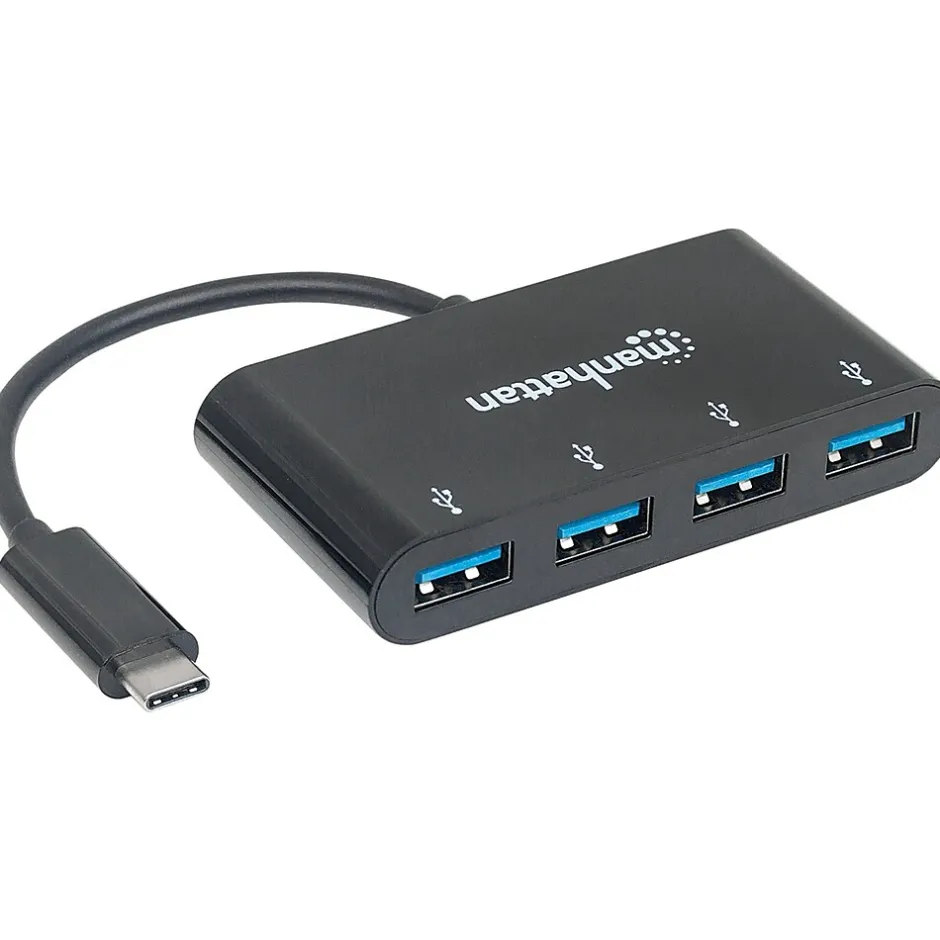 The Manhattan SuperSpeed USB 3.1 Hub easily adds 4 SuperSpeed USB-A ports to any USB-C compatible device, expanding connectivity for keyboards, mice, external memory and other peripherals. Its SuperSpeed ports are backward compatible to support older devices, provide data transfer speeds up to 5 Gbps for external storage, printing and other activities, and capable of charging and powering at 5-volt or 1-amp output. A durable case, compact size and bus-power make it easily transportable to add USB connectivity almost anywhere. Installation is simple with plug and play and hot-swappable capabilities, and a built-in USB cable quickly connects the hub to any USB-C port.