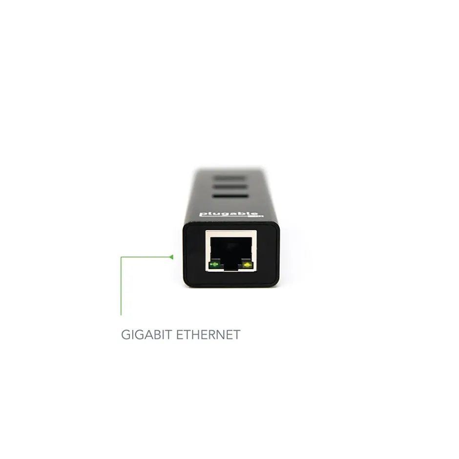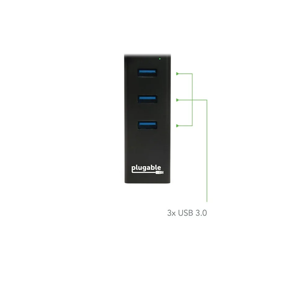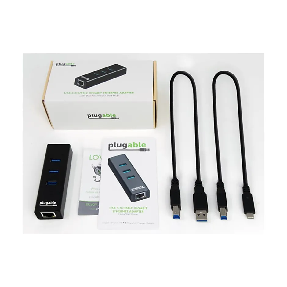 The Plugable USB hub is a simple solution for adding an Ethernet connection to your laptop, ultrabook, and notebook or upgrading your network adapter in your desktop PC. You can also add additional network interfaces and transfer files peer-to-peer over the hub’s wired Gigabit Ethernet network. With three additional USB 3.0 ports, get the connectivity you need. Increase your productivity by adding a flash drive, keyboard, and mouse. Please note that this product is not a solution for connecting a USB device like a printer to a network. Compatible with Apple computers (MacBook Retina, MacBook Pro, MacBook Air), Microsoft Surface series (Surface Pro, Surface Book, Surface Laptop, Surface Go), Dell XPS/Inspiron/Vostro, Chromebooks, and more. Perfect for travelers that need to access a wired network for security, businesses that have a mix of USB 3.0 and USB-C systems, and for anyone that needs the perfect companion to increase their connectivity.