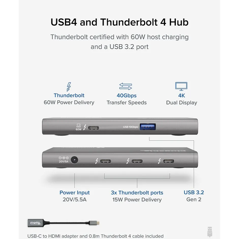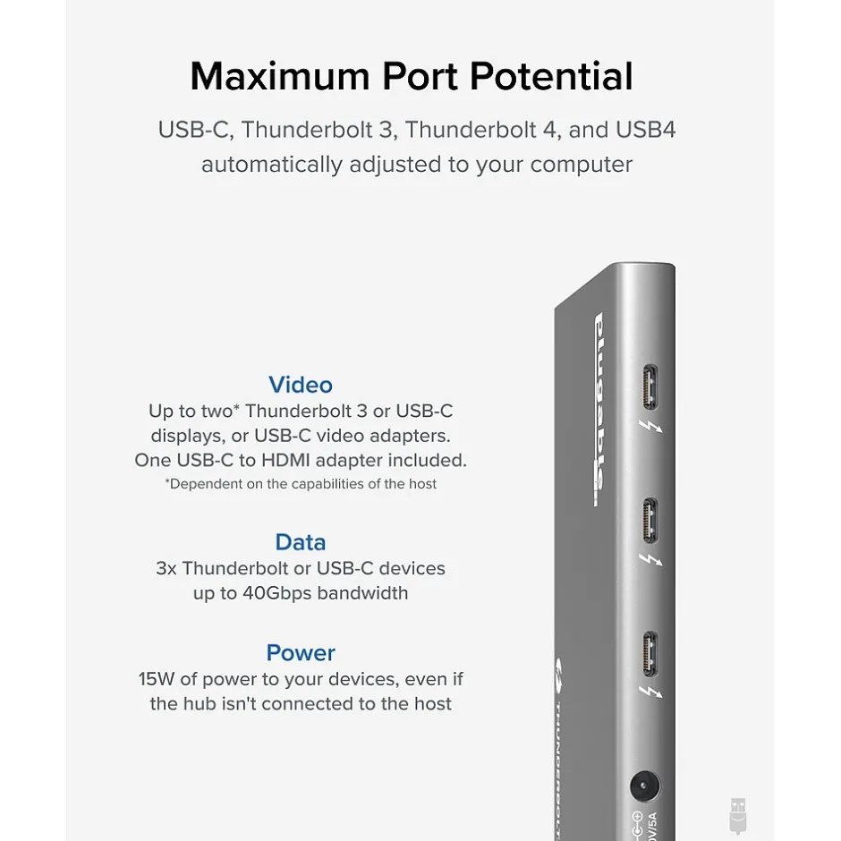- Contains 3 x USB4/Thunderbolt 4 ports for speeds up to 40Gbps, and 15W charging for phones and tablets; 1 x USB Type-A up to 10Gbps, 1 x upstream Thunderbolt 4 port up to 60W charging to host