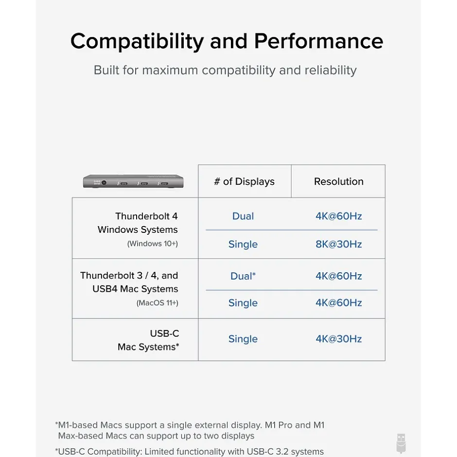 - Compatible with Windows (10+) with Thunderbolt 4/USB4, macOS (11+). USB4/Thunderbolt 4 dock supports two 4K screens at 60Hz, one 8K screen at 30Hz, or one 6K screen on M1 Macs (one USB Type-C to HDMI 2.0 adapter included)