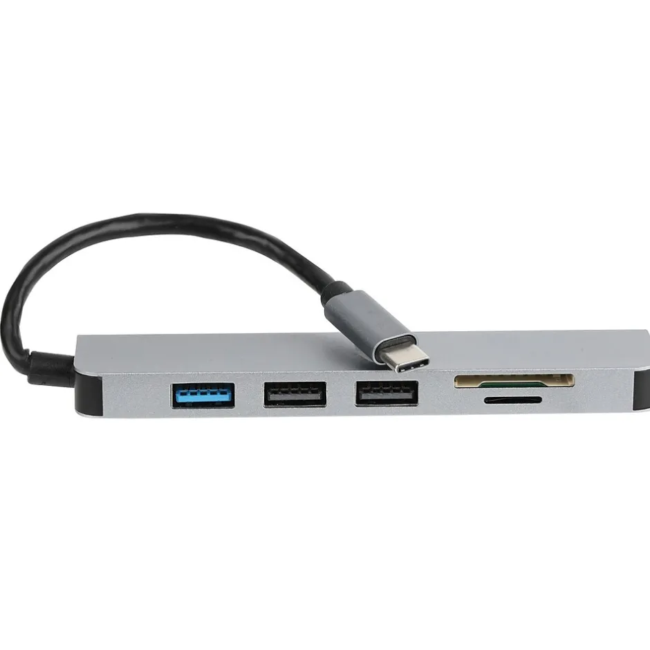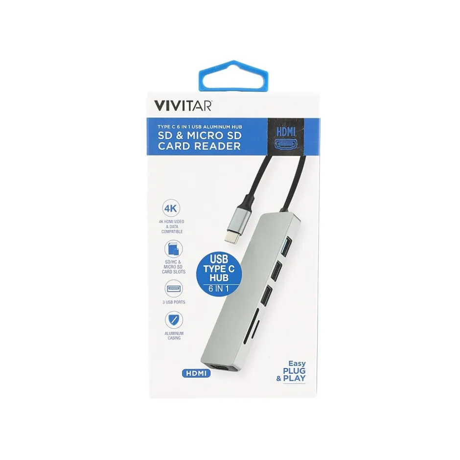 The Vivitar Creator Series six-in-one aluminum adapter with 4K USB Type-C to HDMI interface, SD and microSD card reader, and three USB ports provides more ports to connect your devices. The hub features a 4K HDMI output to mirror or extend your device and stream 4K UHD or Full HD (1080p) to any TV, projector, or monitor. You can connect up to three additional USB devices like printers, keyboards, mouses, or flash drives with data transfer speeds up to 5Gbps. The built-in SD/SDHC and microSD card reader slots let you copy photos and videos easily. This Vivitar USB Type-C hub features a compact and lightweight aluminum design that is perfect for home, office, or on the go. Works with MacBooks, Chromebooks, and Windows laptops with a USB Type-C port.