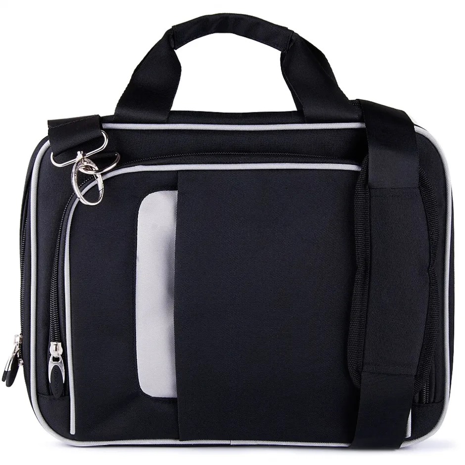 - Compact and durable with padded shoulder strap and top handles