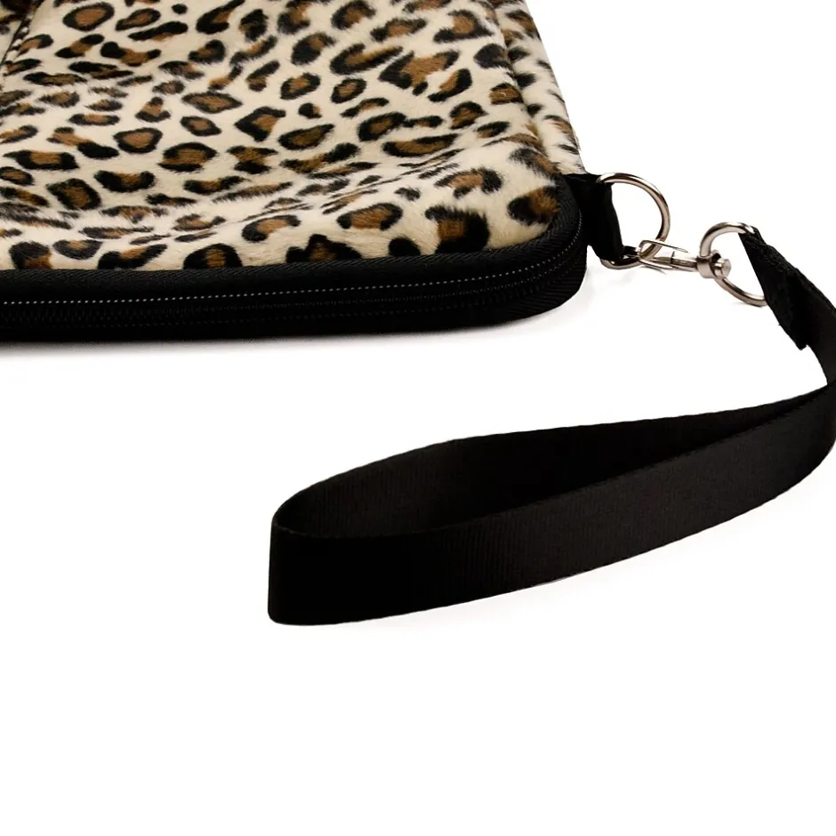 Faux Leopard fur. Safely carry your laptop with this Universal Sleeve Case designed for notebooks computers. This is for laptop size 15″. Protects your Laptop from bumps, shock and scratches. It incorporates a lightweight design for easy mobility and a heavy duty zipper closure. Lets you tote your Laptop anywhere, conveniently and safely, in any briefcase or backpack! Removable hand strap for carrying convenience. External Dimension: 16″ x 10 3/8″ x 0.5″