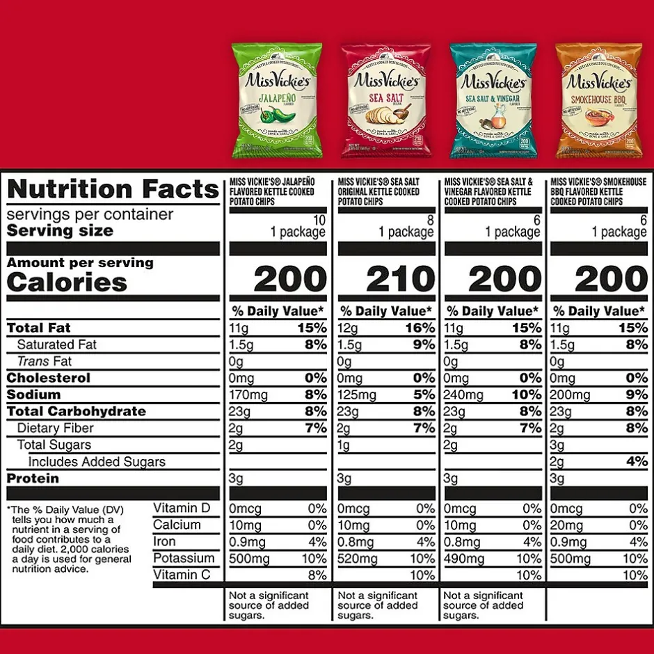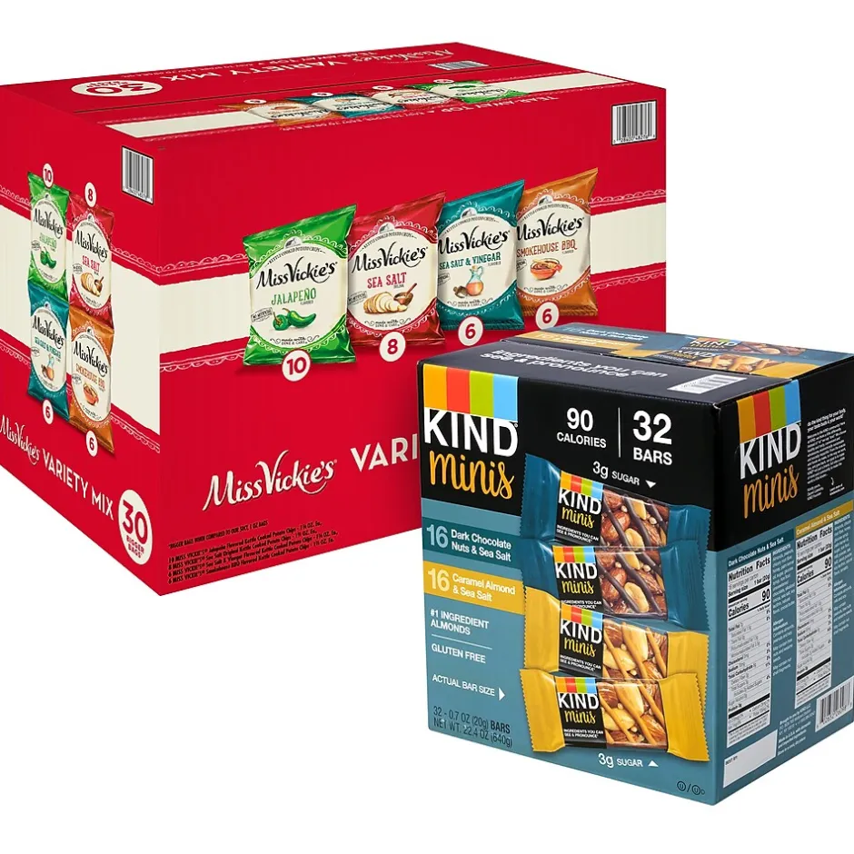 - KIND Minis Dark Chocolate Nuts & Sea Salt and Caramel Almond & Sea Salt Variety, 0.7 oz, 32 Count and MISS VICKIE’S Kettle Cooked Chips Variety Mix, 1.375 oz, 30 Count