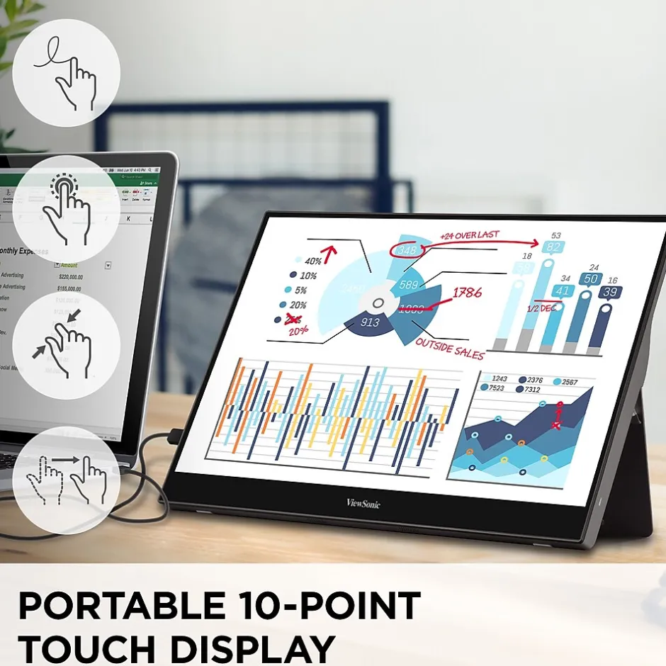 The ViewSonic TD1655 is a portable 15.6” touch display designed for productivity on the go. Built for business travelers, remote workers, and digital nomads, the TD1655 can serve as a complementary touchscreen to a laptop or tablet for boosted productivity. With an anti-glare screen and Full HD 1080p resolution, this touch display delivers a crystal-clear viewing experience so users can see more and do more for a more efficient workflow. In addition, with a 10-point projective capacitive touchscreen and included stylus pen, the TD1655 delivers a smooth and natural writing experience and streamlined navigation with every tap, pinch, and swipe. A USB Type-C port enables quick and easy transmission of video, and audio. A second USB Type-C port also delivers up to 60W of two-way power: a connected laptop can power the TD1655, OR the TD1655 can power a connected laptop via a USB-C power bank or AC adapter and outlet. Measuring less than an inch thick and weighing only two pounds, the ultra-slim TD1655 perfectly fits into any bag, briefcase, or backpack so you can work wherever life takes you.