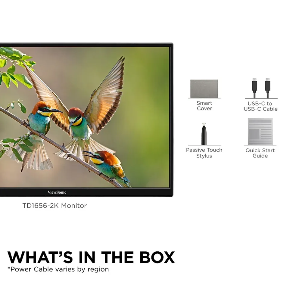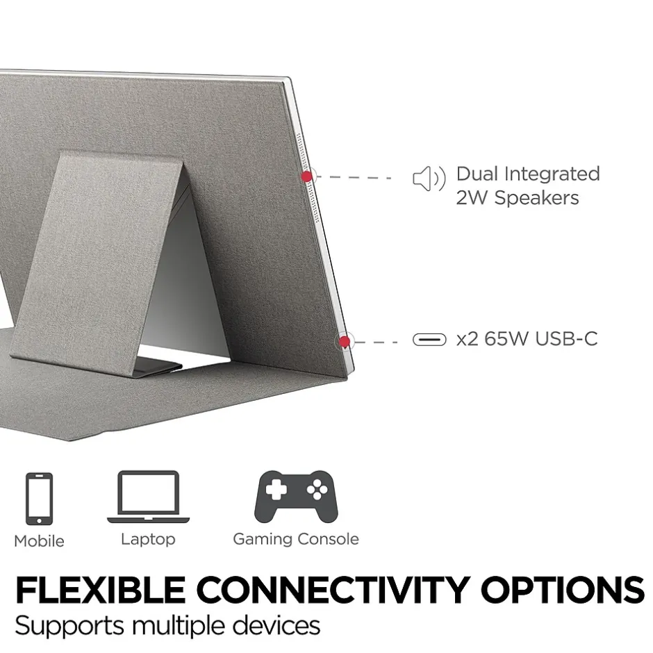TD1656-2K is a portable 16” 16:10 monitor designed for optimal productivity on the go. Weighing less than 2lbs and under 0.5” thick, with an intuitive smart cover to both provide versatile viewing options and protect the screen in transit, this portable is optimized to take on the road. 10-point capacitive touch allows for intuitive screen control while 2K resolution offers vivid details for crispy and clear imagery. The two way power USB-C connectors provide a one-cable solution for multimedia transfer and 65W power charging, either receiving power from a laptop or power bank, or being able to pass through power to the connected device, when the portable is connected to a power source.