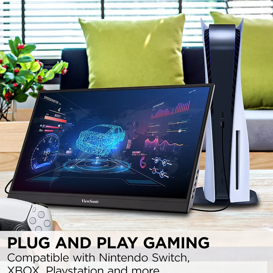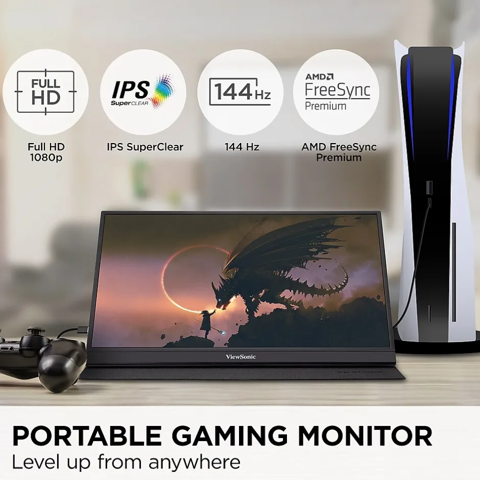 The ViewSonic VX1755 is a 17.2-Inch portable monitor designed for mobile PC and console gaming. With a bright and vibrant Full HD display, and a lightning-fast 144Hz refresh rate, this monitor delivers a powerful, desktop-level gaming experience within a portable package. Equipped with AMD FreeSync Premium technology, the VX1755 delivers seriously smooth gameplay for serious gamers. The VX1755 can also serve as a complementary screen to a laptop or tablet for boosted productivity. With an anti-glare screen and Full HD 1080p resolution, this monitor delivers a crystal-clear viewing experience so users can see more and play more. A USB Type-C port enables quick and easy transmission of video, and audio. A second USB Type-C port allows for power when using a console, or a port to connect the keyboard and mouse when on PC. Ultra-slim, compact and lightweight, the VX1755 perfectly fits into any bag, briefcase or backpack for gaming on the go.