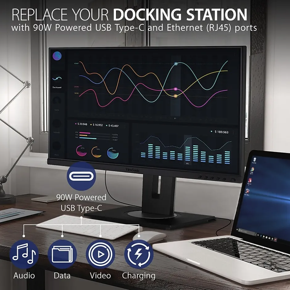 Designed to boost productivity and maximize output, the ViewSonic VG2456a is a 24-Inch docking monitor that transforms your desktop into a streamlined and efficient workspace. Enjoy reliable and flexible network connectivity with the integrated gigabit Ethernet port, while the latest USB 3.2 Type-C connectivity makes dual-monitor setup a breeze and provides up to 90W power delivery to your laptop. That’s not all, the integrated USB hub also provides single-cable simplicity for connecting and charging your peripherals and accessories. A best-in-class ergonomic design features 40-degree tilt and bi-directional pivot so your screen and workspace are as comfortable as you need. In addition, the included vDisplay software gives you quick and easy OSD control, as well as customized screen templates for easy multi-tasking. This monitor is also shipped in eco-friendly biodegradable packaging, along with an easy-to-install quick release stand that makes for quick deployment and a lower total cost of ownership.