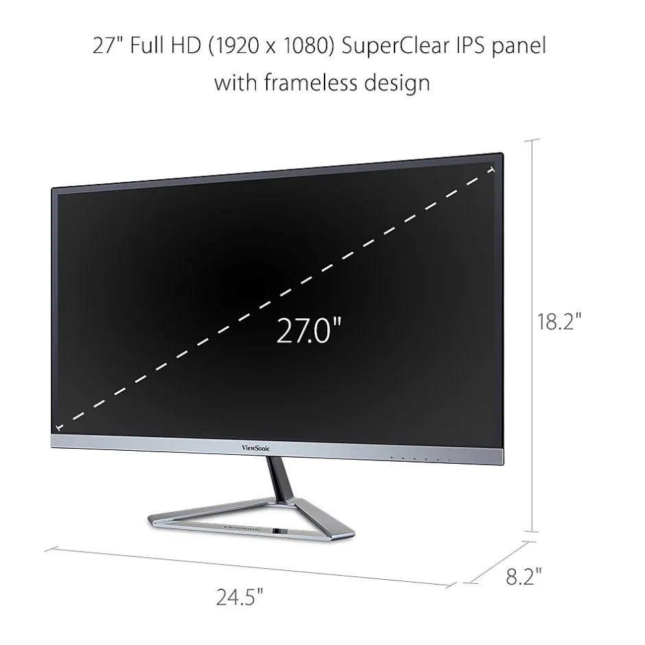 The ViewSonic VX2776-smhd is a sleek 27-Inch Full HD monitor with a modern and minimalist style perfect for home use. With SuperClear IPS Panel technology, this monitor offers best-in-class screen performance with ultra-wide viewing angles. A premium ID includes an ultra-slim profile, unique desktop stand, and a sleek edge-to-edge frameless design, that when combined with vivid 1920×1080 resolution and dual speakers, deliver an immersive viewing experience for home entertainment and multimedia applications. HDMI, DisplayPort, and VGA inputs offer flexible connectivity options for both computing and gaming environments, while ViewSonic’s exclusive ViewMode feature provides intuitive presets for optimized screen performance in different applications. In addition, Flicker-Free technology and a Blue Light Filter help to minimize eye strain from extended viewing periods. With ViewSonic’s industry-leading 3-year limited warranty, this monitor is a solid long-term investment that combines style and high performance for the home.