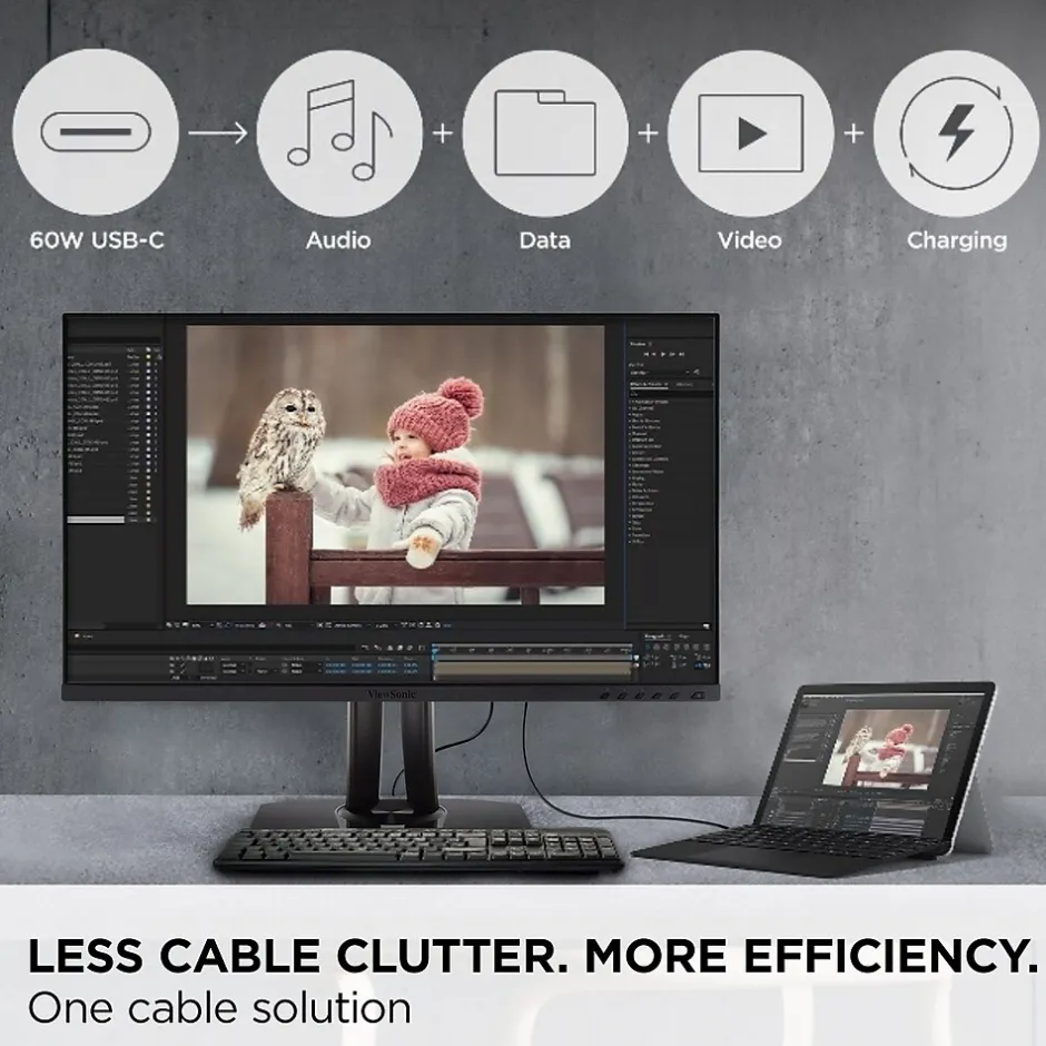 The ViewSonic VP275-4K monitor is compatible with all USB Type-C Surface devices and is perfect for office and home use. USB Type-C connectivity offers convenient charging power, video, and audio over a single cable. Along with USB Type-C, additional connectivity options include HDMI, DisplayPort, and a USB hub. With Pantone validation, stunning 4K resolution, and outstanding color accuracy, this monitor offers vivid detail and realistic color. In addition, the monitor includes an advanced ergonomic design that features height adjustment, pivot, swivel, and tilt for maximum comfort and enhanced productivity.