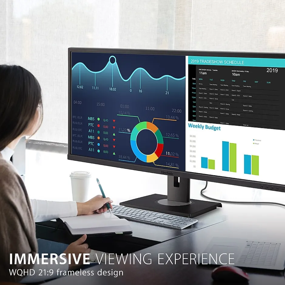 Featuring an ultra-wide 34” screen with a design to boost productivity and maximize output, the ViewSonic VG3456 is a docking monitor that transforms your desktop into a streamlined and efficient workspace. With WQHD 3440 x 1440 resolution, the VG3456 delivers 2.4 times more pixels than standard Full HD monitors, giving users more detail for enhanced productivity. A 21:9 aspect ratio and slim bezels provide extra screen real estate so users can display more content, switch between applications more quickly, view documents side by side, and view multiple windows at once. Enjoy reliable and flexible network connectivity with the integrated gigabit Ethernet port while the latest USB Type-C connectivity provides up to 90W power delivery to your laptop. That’s not all, the integrated USB hub also provides single-cable simplicity for connecting and charging your peripherals and accessories. In addition, the included vDisplayManager software gives you quick and easy OSD control, as well as customized screen templates for easy multi-tasking. This monitor is also shipped in eco-friendly biodegradable packaging, along with an easy-to-install quick release stand that makes for quick deployment and a lower total cost of ownership.