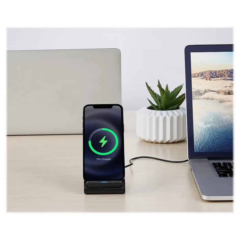 Charging your phone has never been easier with the Gomovi by Vivitar wireless charging stand. Compatible with all Qi enabled wireless charging devices, the stand delivers 10W of quick charging power, giving you more time to talk, text, and browse. Place your phone horizontally or vertically, so you can scroll or watch a video while charging. The stand features a LED indicator light to inform you that your device is charging, and comes with a Micro-USB cord to recharge the device.