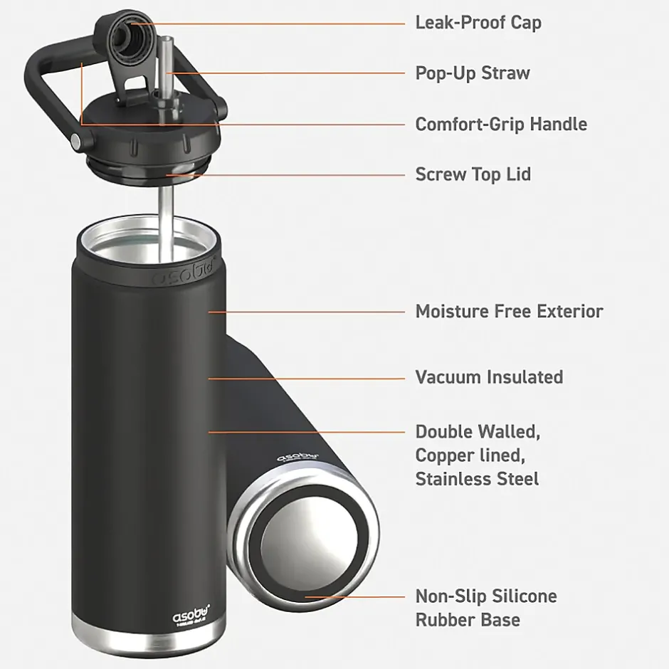 Stay hydrated on your next adventure with the ASOBU Canyon Bottle in Black! Even with its large 50-oz. capacity, the Canyon Bottle is easy to carry, thanks to its comfort-grip handle with soft-touch insert. And you don’t have to turn it upside down to drink because it features a built-in pop-up straw! The silicone rubber nonslip base keeps the bottle from sliding (and from making a racket when you put it down). ASOBU has thought of every possible feature to make your life easier — and they’ve put it in this bottle.