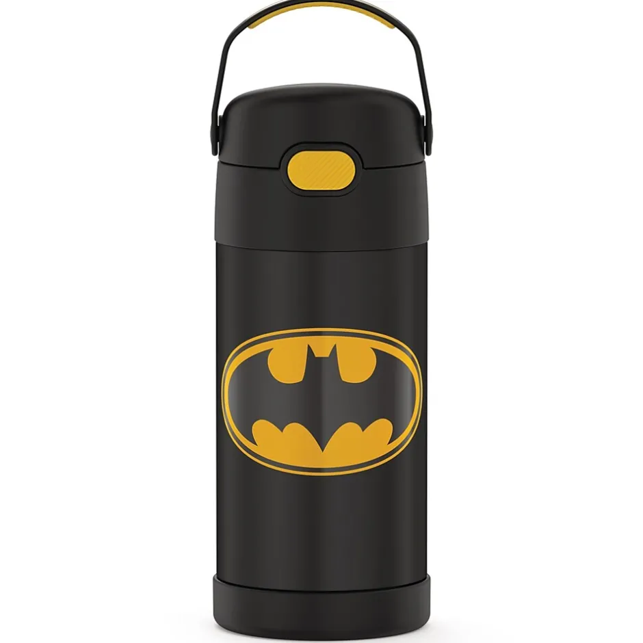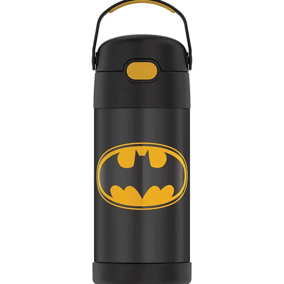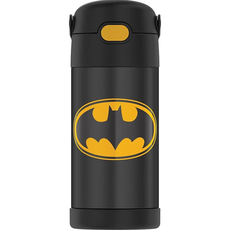 The Thermos 12 Oz. FUNtainer Stainless Steel Bottle keeps drinks cold for up to 12 hours. The double wall stainless steel construction is built to handle drops, dings and assorted roughhousing. Featuring a hygienic, push-button lid, this bottle is easy to open and drink from. To clean, you can pop your Batman FUNtainer Bottle in the dishwasher; however washing by hand is recommended.