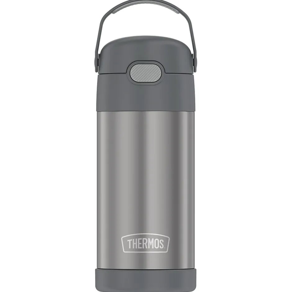 The Thermos 12 Oz. FUNtainer Stainless Steel Bottle keeps drinks cold for up to 12 hours. The double wall stainless steel construction is built to handle drops, dings and assorted roughhousing. Featuring a hygienic, push-button lid, this bottle is easy to open and drink from. To clean, you can pop your Gray FUNtainer Bottle in the dishwasher; however washing by hand is recommended.