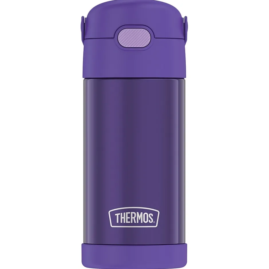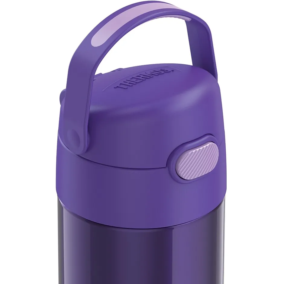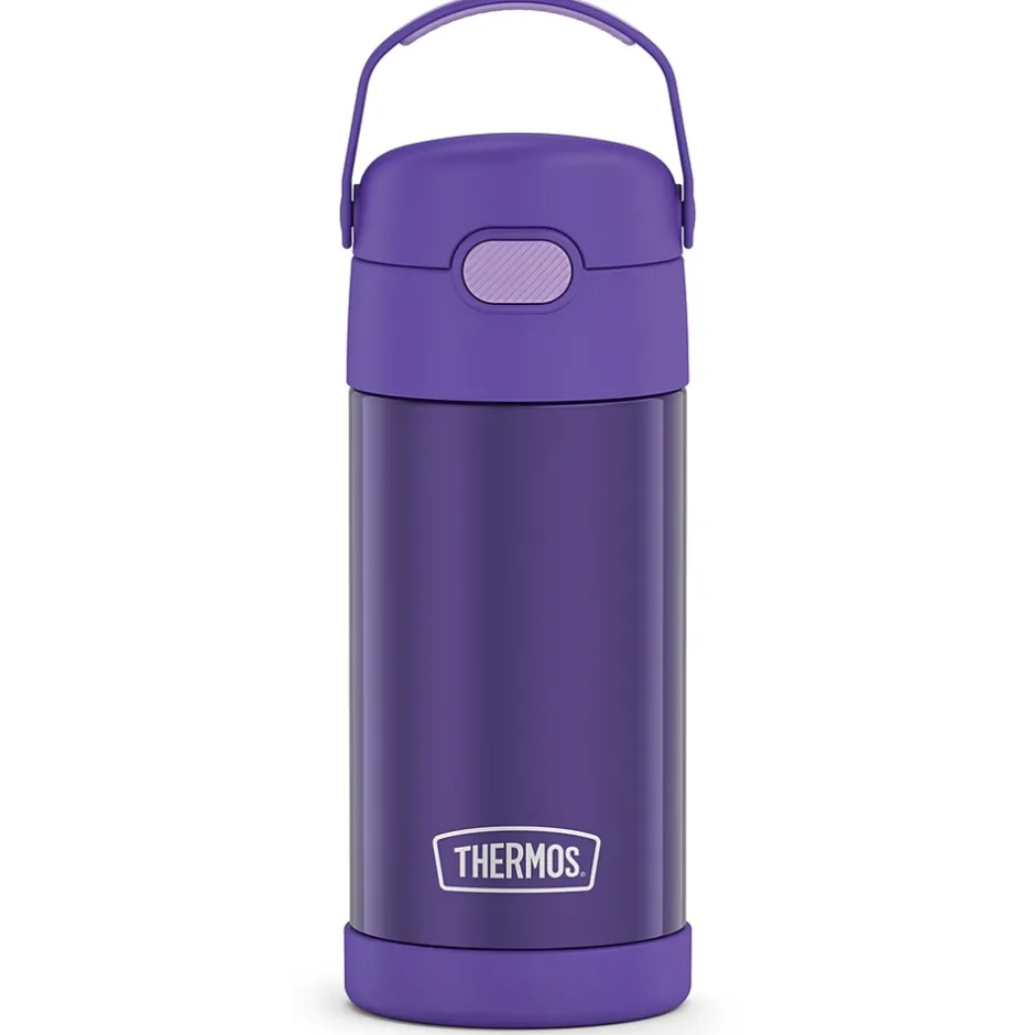 The Thermos 12 Oz. FUNtainer Stainless Steel Bottle keeps drinks cold for up to 12 hours. The double wall stainless steel construction is built to handle drops, dings and assorted roughhousing. Featuring a hygienic, push-button lid, this bottle is easy to open and drink from. To clean, you can pop your Purple FUNtainer Bottle in the dishwasher; however washing by hand is recommended.