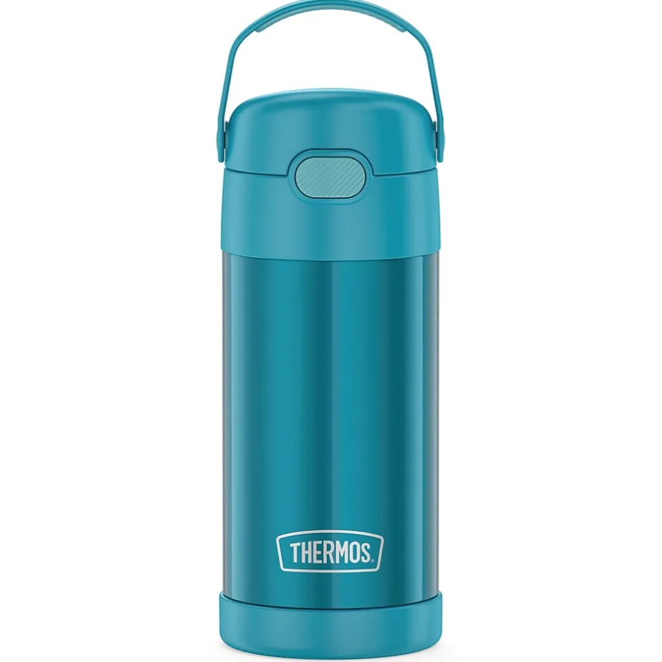 The Thermos 12 Oz. FUNtainer Stainless Steel Bottle keeps drinks cold for up to 12 hours. The double wall stainless steel construction is built to handle drops, dings and assorted roughhousing. Featuring a hygienic, push-button lid, this bottle is easy to open and drink from. To clean, you can pop your Teal FUNtainer Bottle in the dishwasher; however washing by hand is recommended.