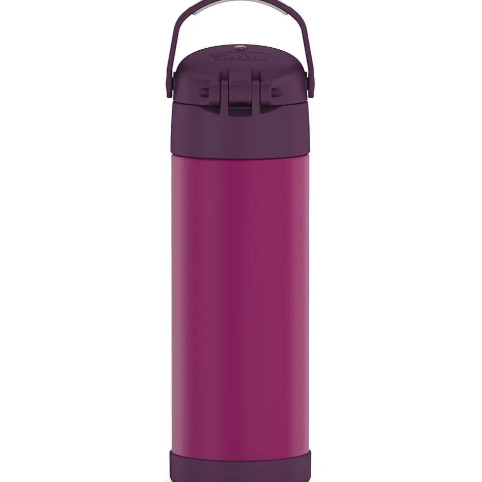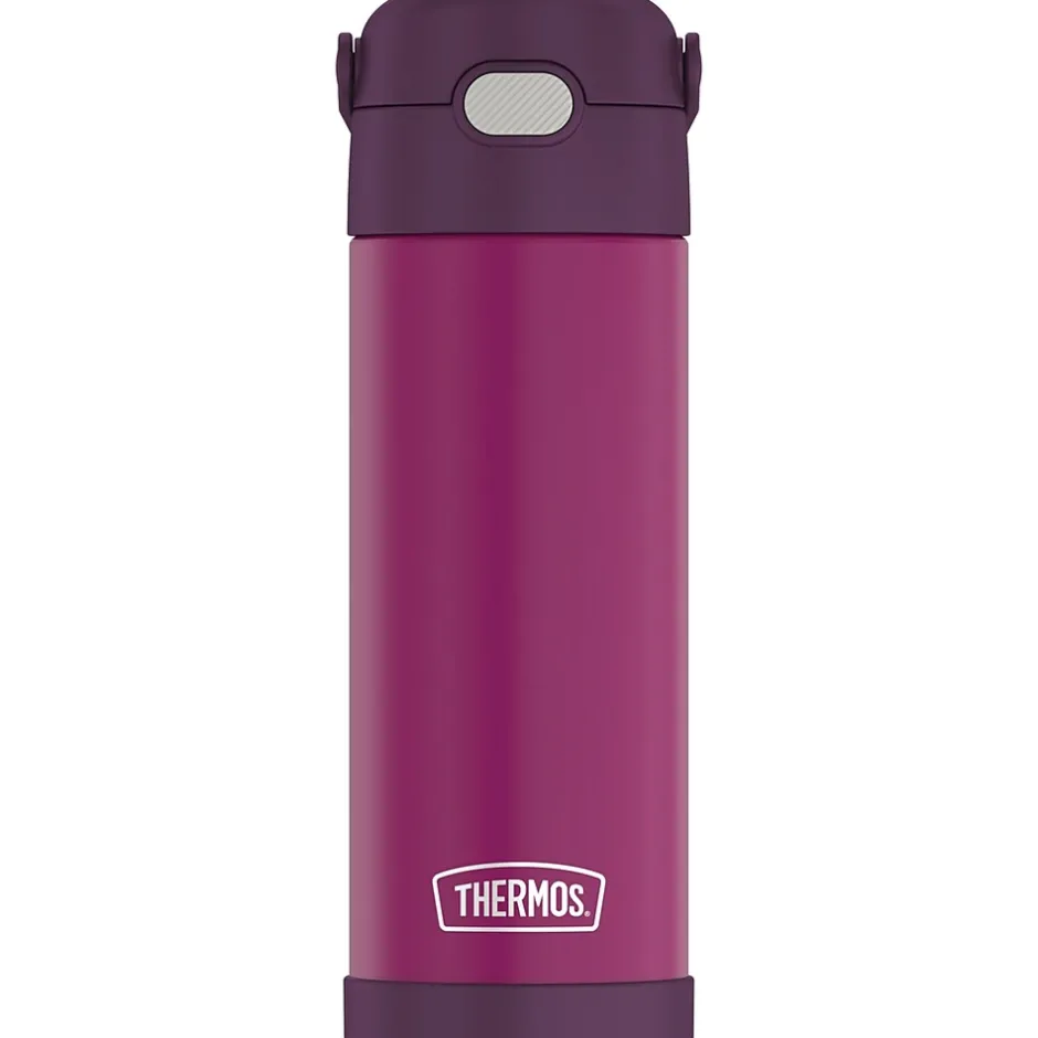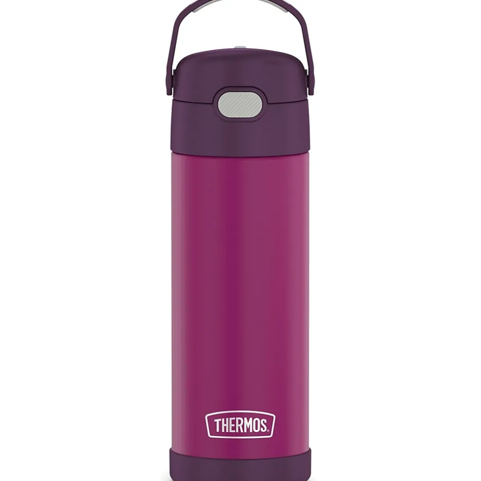 Thermos brand products offer superior cold retention that keeps beverages cool and delicious for hours, and the 16 Oz. FUNtainer Non-Licensed Stainless Steel Bottle with Spout is no exception. Thermos vacuum-insulation technology virtually eliminates temperature change within the beverage container by creating an airless space between 2 stainless steel walls, keeping your child’s beverages colder, fresher, longer. This hydration bottle keeps beverages cold up to 12 hours. Constructed with double wall stainless steel, this Red Violet bottle is built to withstand the demands of everyday use. It also features a hygienic, push-button lid and an integrated, flip-up carrying loop.