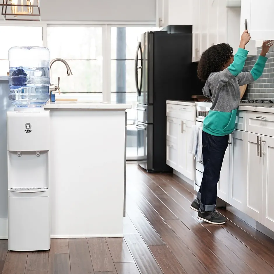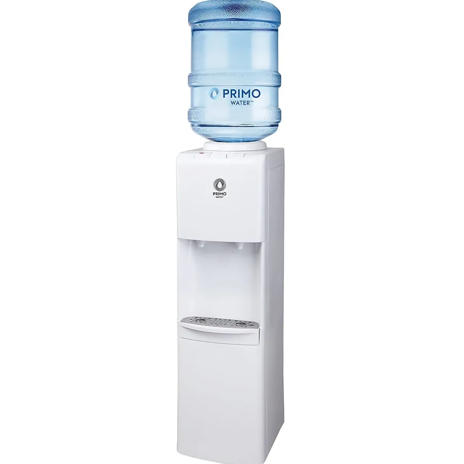 Primo Water’s Hot and Cold top-loading water dispenser is the ultimate solution for instant hydration and convenience. With its new and improved 2.0 compressor cooling system, enjoy the luxury of fast-flowing cold and hot water at the touch of a button. Say goodbye to the hassle of constantly refilling water bottles, thanks to its generous capacity, accommodating 3-5 gallon bottles. The Primo Water White Top Load Water Dispenser ensures durability for long-lasting performance. With its spill-proof design featuring Leak Guard technology, you can enjoy a mess-free dispensing experience. Designed with families in mind, our dispenser includes a child safety latch for added peace of mind. And with its ENERGY STAR certification, you can reduce electricity usage while minimizing single-serve bottle waste.