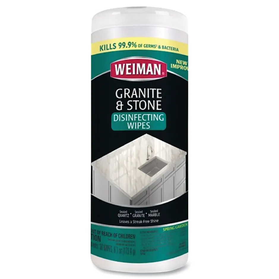 Clean, shine and disinfect your sealed stone surfaces in one easy step. Improved formula kills 99.9% of all germs and bacteria within four minutes of contact. Granite and Stone Disinfectant Wipes not only disinfect and clean up the toughest messes, but they also leave a pristine, streak-free shine. Use these handy wipes on any sealed stone surface including granite, marble, quartz or even glazed ceramics to maintain countertops, floors, showers, sinks and more throughout kitchens, bathrooms, lobbies and other areas where artisan-stone and ceramics can be found.