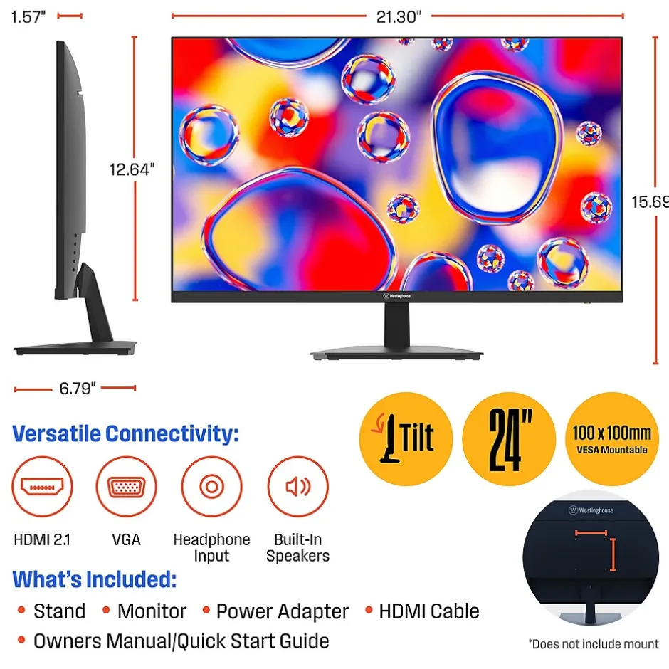 Elevate your viewing experience with our 24-inch Full HD IPS monitor, featuring 1080p resolution for vibrant color accuracy and wide viewing angles. The 100Hz refresh rate ensures smooth motion, ideal for gaming and fast-paced activities, while Adaptive Sync reduces screen tearing and input lag. Enjoy clear audio from built-in speakers, and protect your eyes with EyeRest Technology, offering flicker-free, anti-glare, and low blue light settings. Easily connect modern and legacy devices with HDMI and VGA compatibility. HDMI cable included.