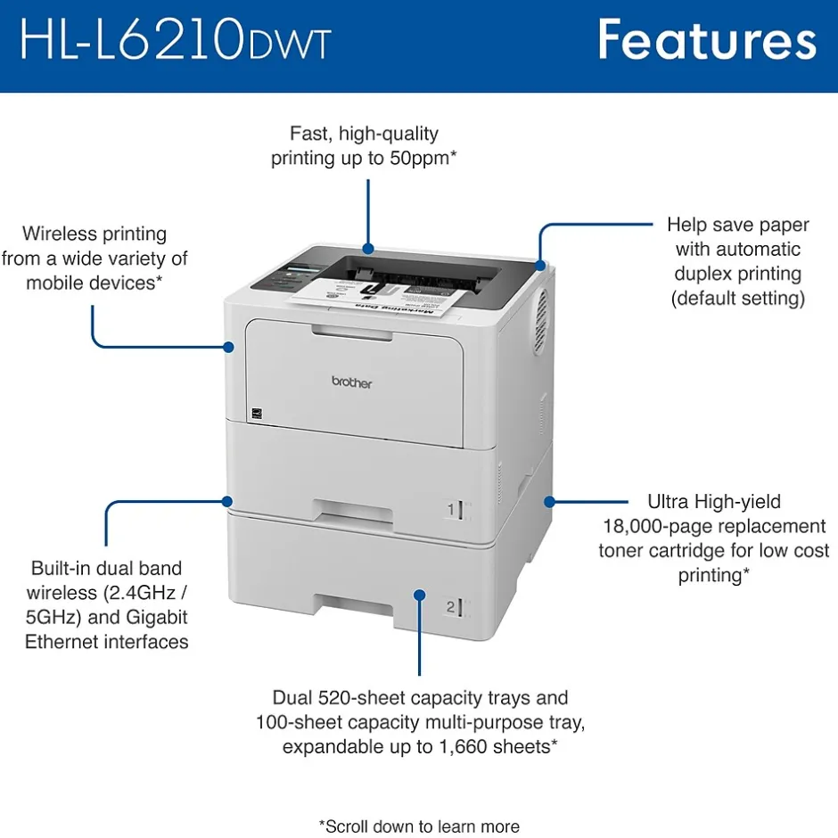 The Brother HL‐L6210DWT business monochrome laser printer is a great choice for busy offices and workgroups with higher print volumes that need fast, high‐quality output, low‐cost printing, large paper capacity, and advanced security features. This high‐performance printer helps to increase productivity with a fast print speed of up to 50ppm(1). Reduce paper refills with dual 520‐sheet capacity paper trays. Offers a large, expandable paper capacity that is scalable as your business needs grow. Delivers low‐cost printing by using the TN920UXXL Brother Genuine ultra high‐yield replacement toner cartridge. Triple Layer Security features help to limit document and device access and protect against network intrusions. The HL‐L6210DWT also provides flexible connectivity with built‐in Gigabit Ethernet and dual band wireless networking, plus convenient mobile device printing to meet mobile workforce demands(2).