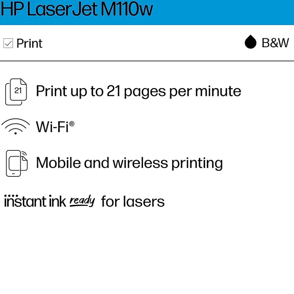 The world’s smallest laser printer in its class, the HP LaserJet M110w is perfect for printing black & white forms and documents. It offers high-speed printing, seamless setup and reliable connectivity.