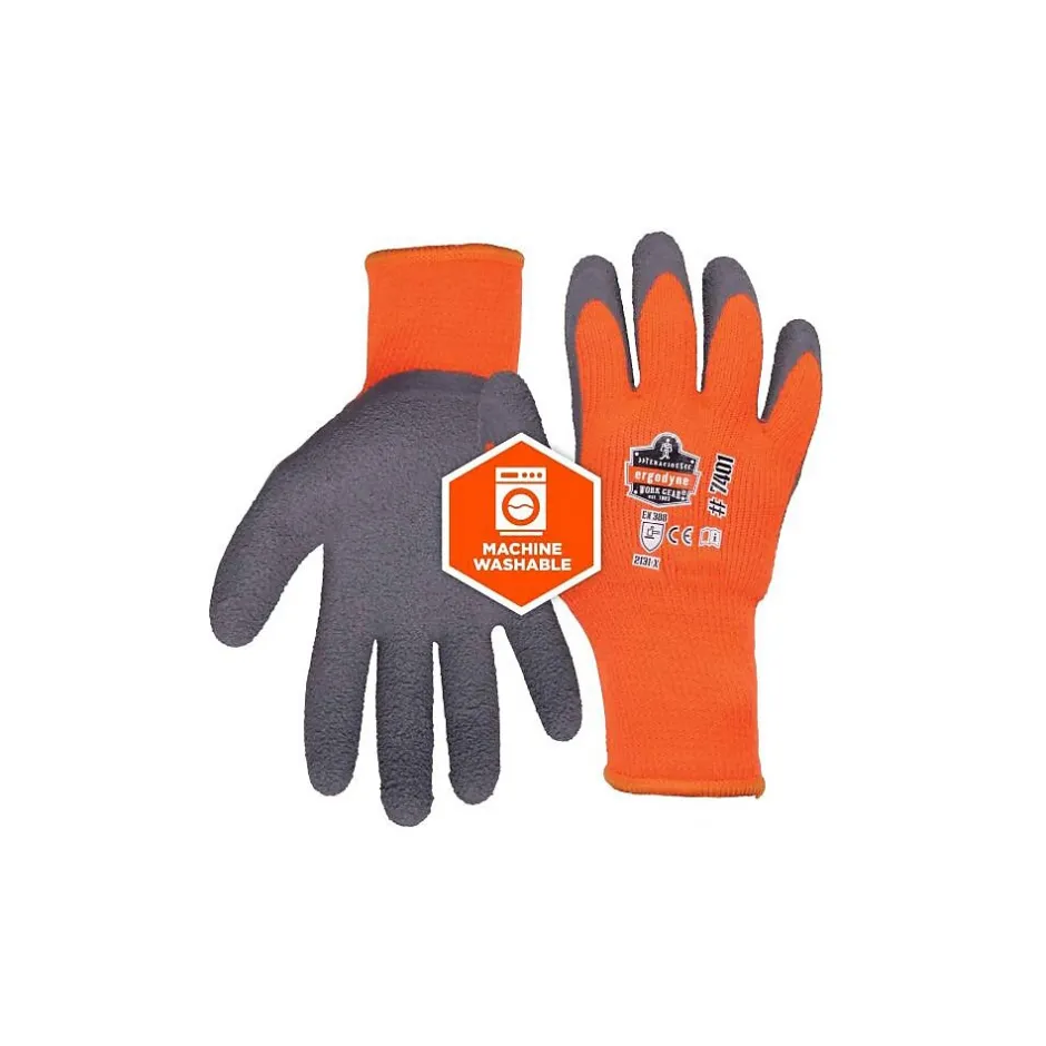The Ergodyne ProFlex 7401 coated winter work gloves provide lightweight warmth and durable grip in cool to cold temperatures. Lined with fleece for soft thermal protection, and a flexible, latex-coated palm allows for secure gripping. Unlike typical thermal work gloves, these gloves are extremely lightweight and highly dexterous. A breathable 10g brushed acrylic fleece liner protects hands from cool air. The knit construction and elastic wrist form a comfortable fit that does not compromise dexterity, and the latex-coated palm is both flexible and durable for handling equipment or materials. These coated gloves meet the EN 388:2131X standard for cut resistance.