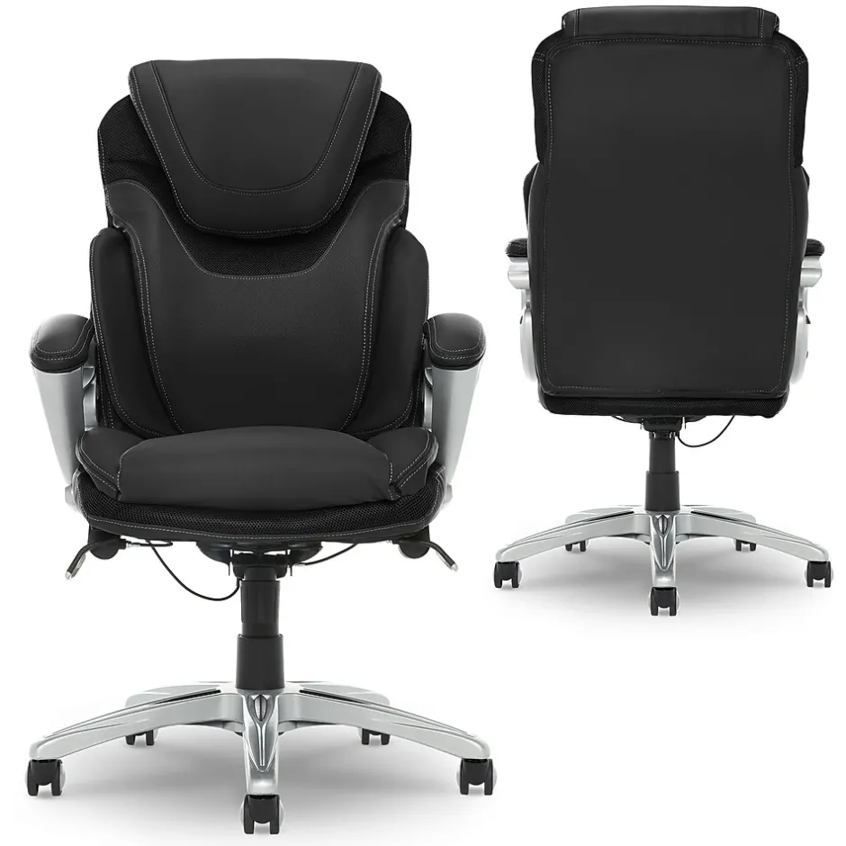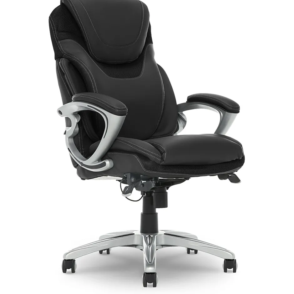 Designed for those that sit for long periods of time, the Serta Works executive office chair with AIR technology is rich with ergonomic enhancements to maximize comfort and wellness, so you can be more productive. The lumbar with kinetic AIR technology swivels and moves with you for dynamic support that actually helps improve your posture. Its sloping, waterfall seat cushion promotes circulation to decrease uncomfortable leg fatigue, and the pneumatic height and tilt adjustments can be customized with the right fit for you. But this chair is no slouch. Available in gray, cream, and black, and gray bonded leather, the chair’s sleek design gives any workstation the executive treatment.
