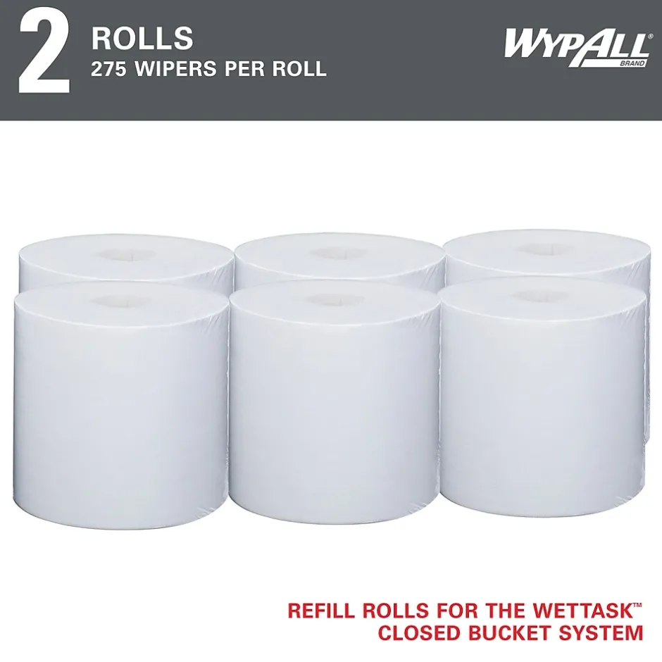 - 275 Sheets/Roll; 2 Rolls of WypAll® PowerClean™ WetTask™ Wipers for Solvents System/Case; 550 Sheets/Case; White; Center-Pull Roll; Refill Only